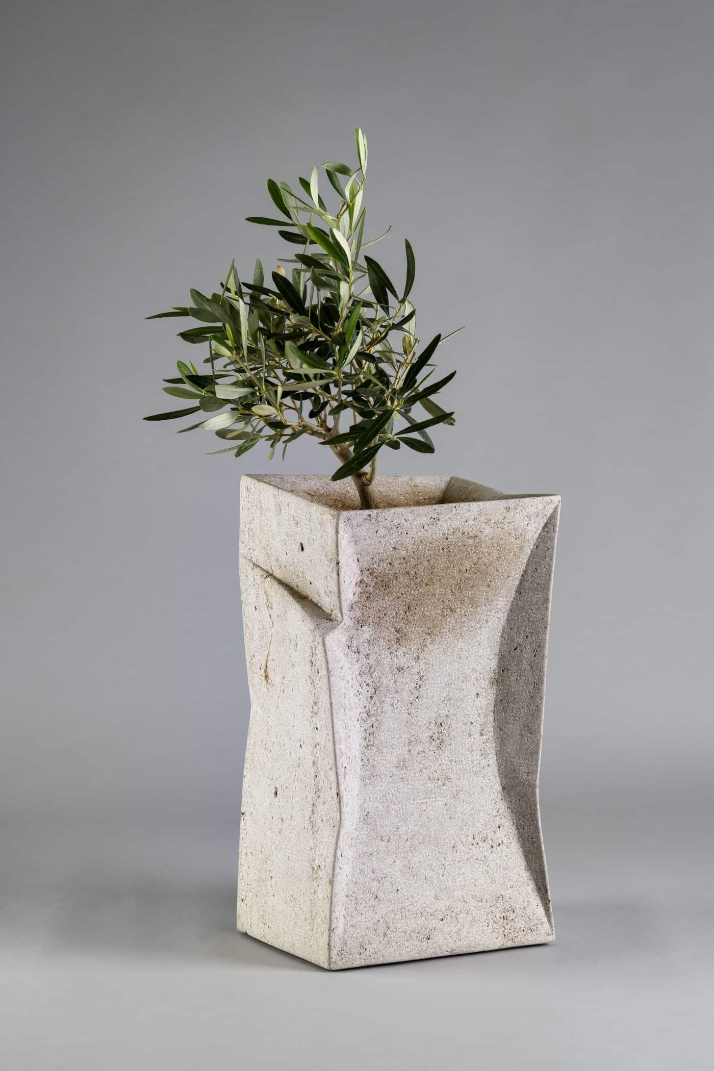 Auch Vasileios arbeitete an seiner individuellen Formsprache: in klarer, reduzierter und schlichter Form fertigt er aus Satteldorfer Muschelkalk ein Pflanzgefäß, in das er einen Olivenbaum setzt. Ineinander greifend und „auf festem Grund“ und handwerklich überzeugend ausgearbeitet steht dieses Bild für die Grundbausteine unseres Lebens – das fest verwurzelte Erbe, das jede(r) von uns in sich trägt.