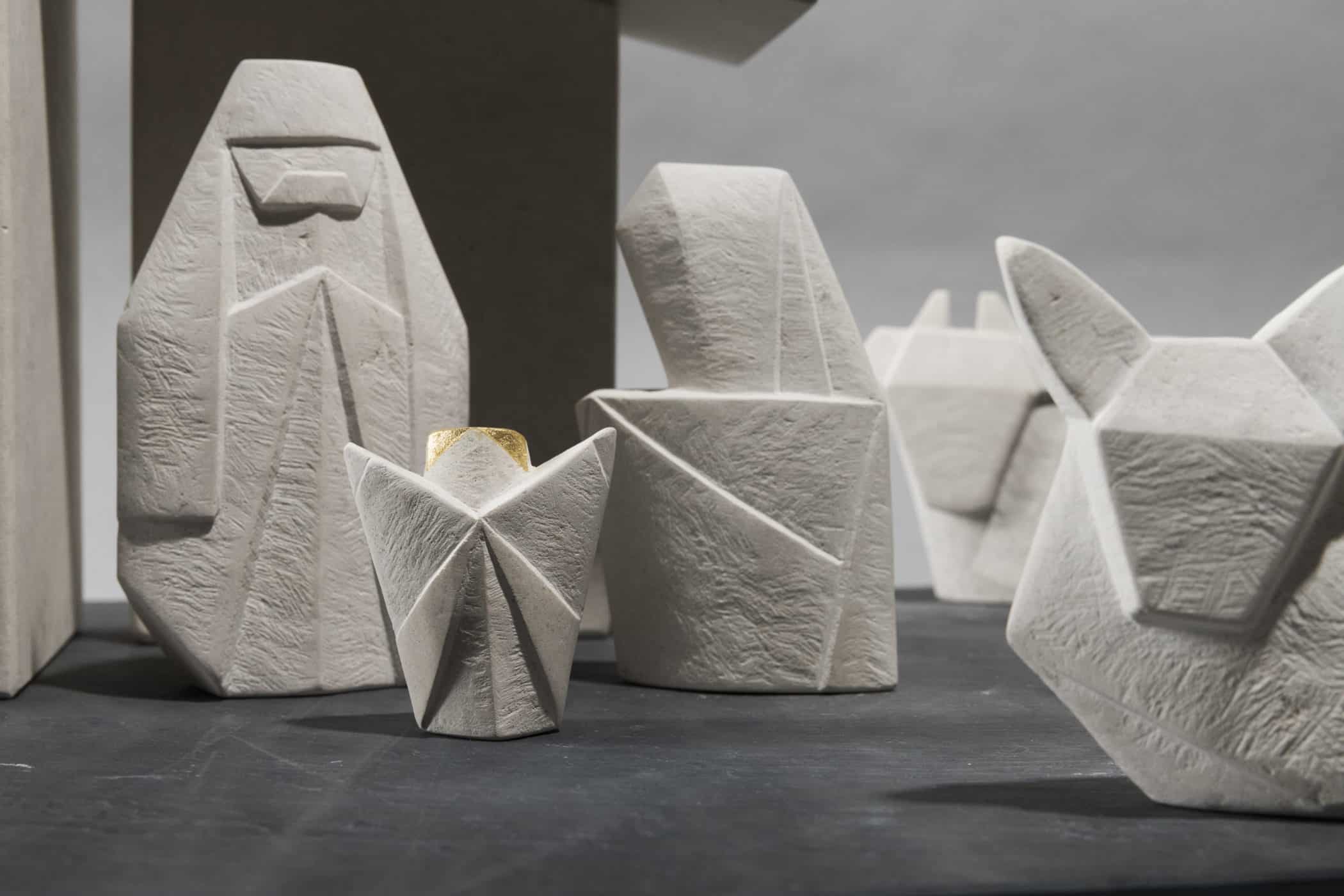 Das Design der Figuren geht auf die japanische Papierfaltkunt, Origami, zurück. Dazu wurde jeden Figur zuerst in Papier gefaltet und danach ins Material Stein übersetzt.