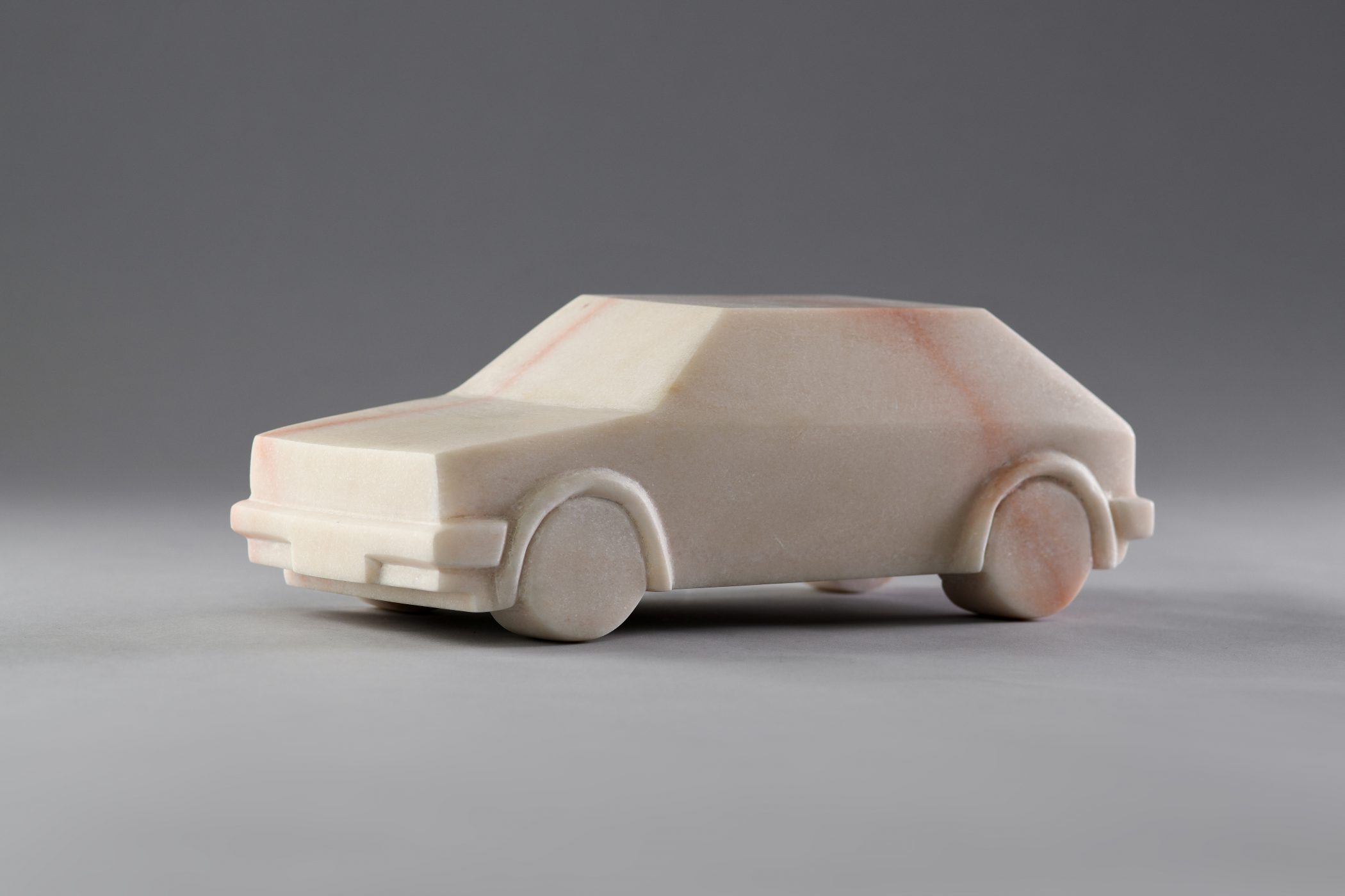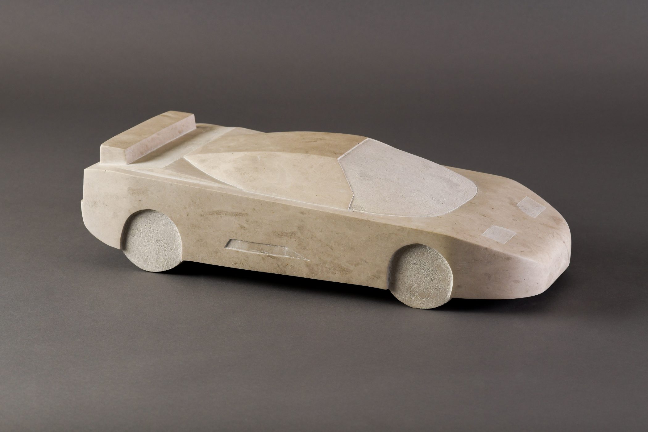 Als erster Schritt wurden mehrere, ca. 10 cm lange Tonmodelle von diversen “Kultautos” hergestellt. Dann kam für jede(n) die berühmte Qual der Wahl, welcher Fahrzeug-Typ es in die engere Auswahl schafft. Im zweiten Schritt wurden Modellautos im Maßstab 1:18 mit Plastilin überzogen und in der Fläche vereinfacht. Zusätzlich veränderten unsere Kunsthandwerker*innen zusätzlich Rundungen zu Kanten. Vereinfacht nachmodelliert, entstand so ein kantigeres Modell. Nach dem Anfertigen eines Gips-Abgusses wurde dieser überarbeitet. Das jeweilige “Kultauto” nahm so weitere Form(en) an – mit präziseren Flächen, exakteren Kanten und scharfkantigerem Profil.