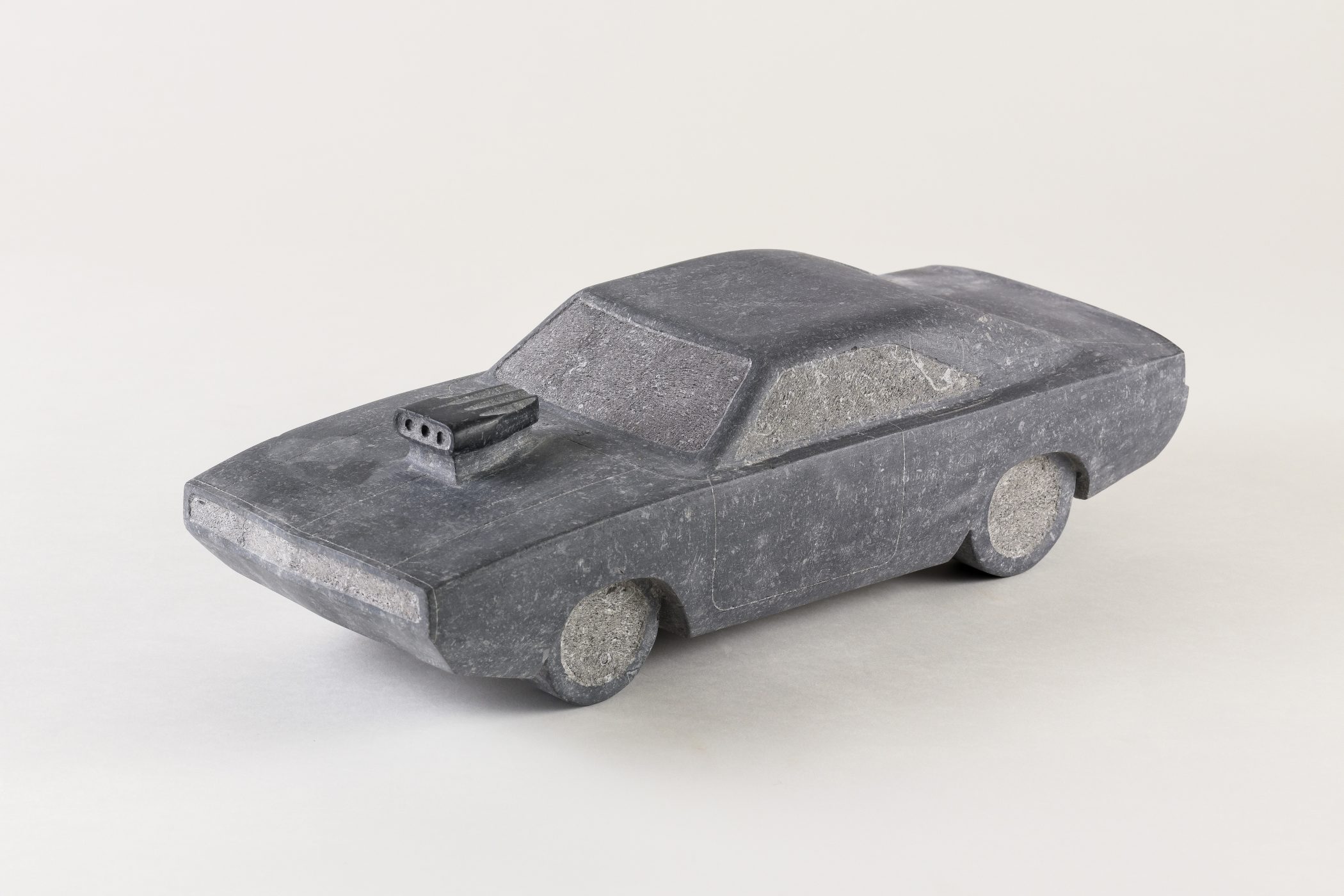 Den Preis des schulinternen Wettbewerbs gewann Johannes Seidl mit seinem steinernen 1970er Modell des„Dodge Charger R/T“. Seit 2001 düst Superstar Vin Diesel als Straßenrennfahrer und Automechaniker Dominic „Dom“ Toretto in mittlerweile acht „Fast and Furious“ Filmen allen davon. Eine Filmreihe, die mit ihren zusätzlichen Spin-Offs selbst längst zum Kult wurde. Ein ganz besonderer Star der Kino-Reihe ist dabei immer wieder ein schwarzer Flitzer, den „Dom“ Toretto von seinem Vater geerbt hat: ein 1970er Dodge Charger R/T. Doch zurück aus Hollywood in unser Schulgebäude – zu Johannes Seidls Version dieses “Kultautos”: Der Graniteffekt des dunkelgrauen Kalksteins sorgte für ein effektvolles Farbenspiel. Präzise gearbeitet, mit handwerklich hervorragender Gestaltung der Oberfläche bis in die Details, gratulierte die Jury ihm zu dieser qualitätvollen Arbeit.